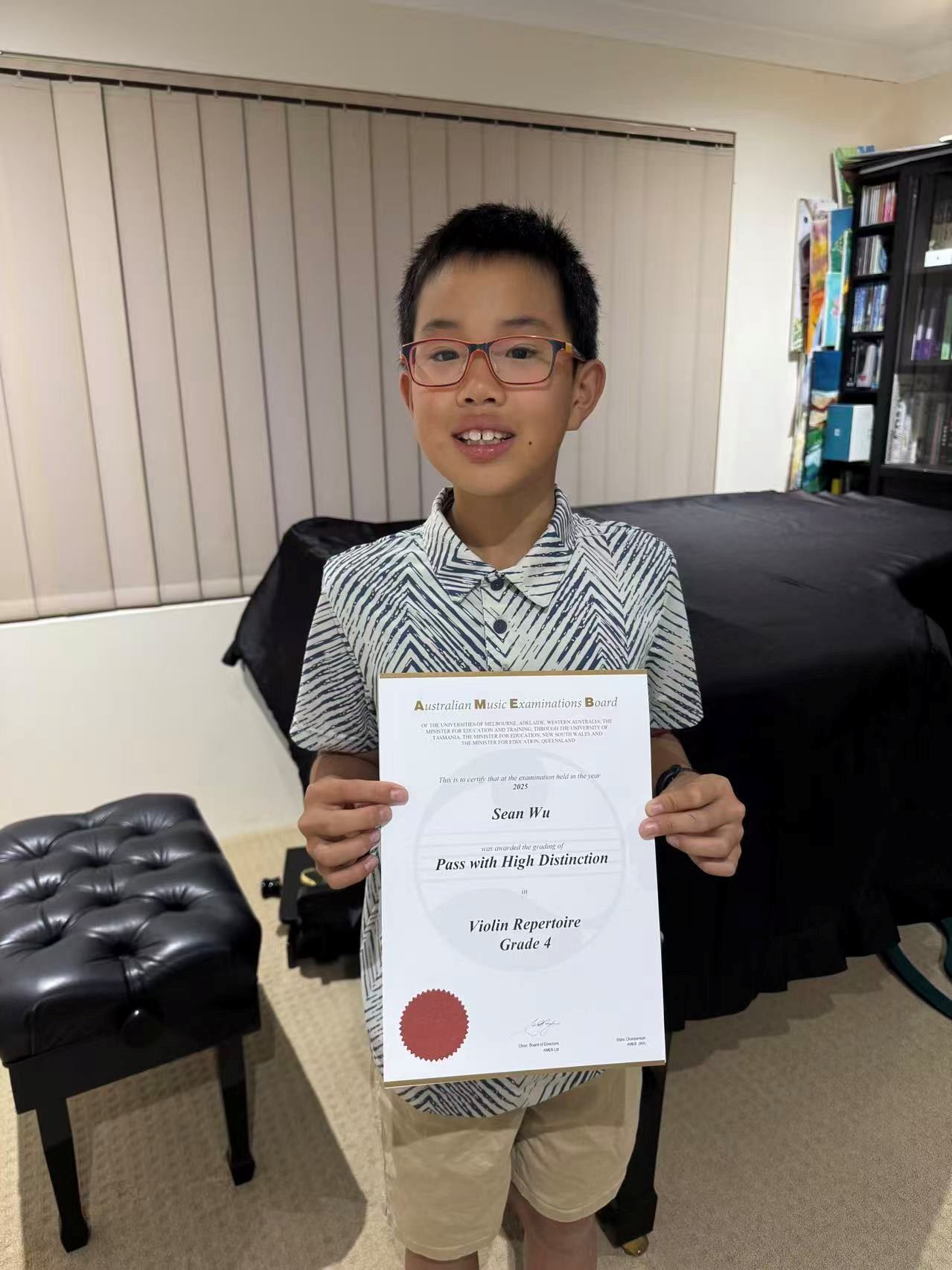 Sean in Year 6, recently undertook the AMEB Grade 4 Violin examination and was awarded a High Distinction (A+).
